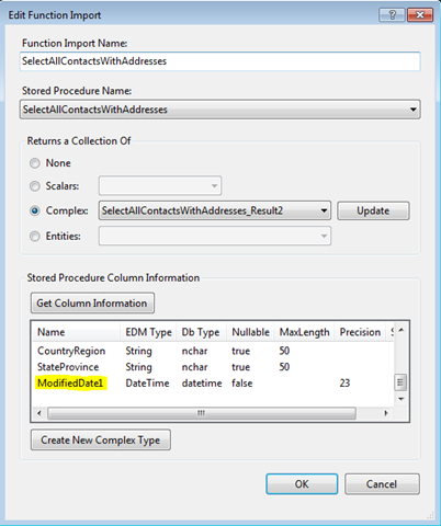 System.Data.EntityCommandExecutionException: The data reader is incompatible with the specified ‘AddressBookModel.SelectAllContactsWithAddresses_Result2’. A member of the type, ‘ModifiedDate1’, does not have a corresponding column in the data reader with the same name.