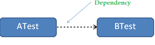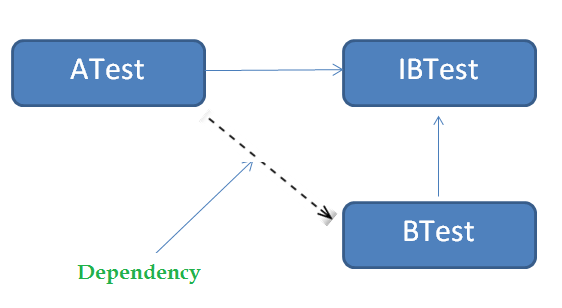 – We are talking about a class (say “ATest”) which needs another class (say “BTest”) to call Its (“ATest”) methods (See below example). Therefore, class “BTest” is a dependency for class “ATest”.